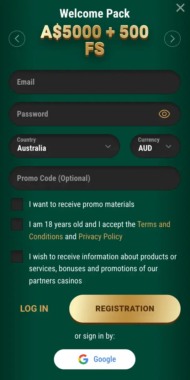 1. Registration | Click the “Sign Up” button. Enter name, date of birth, email, phone and choose AUD as currency. Accept terms and conditions. |
